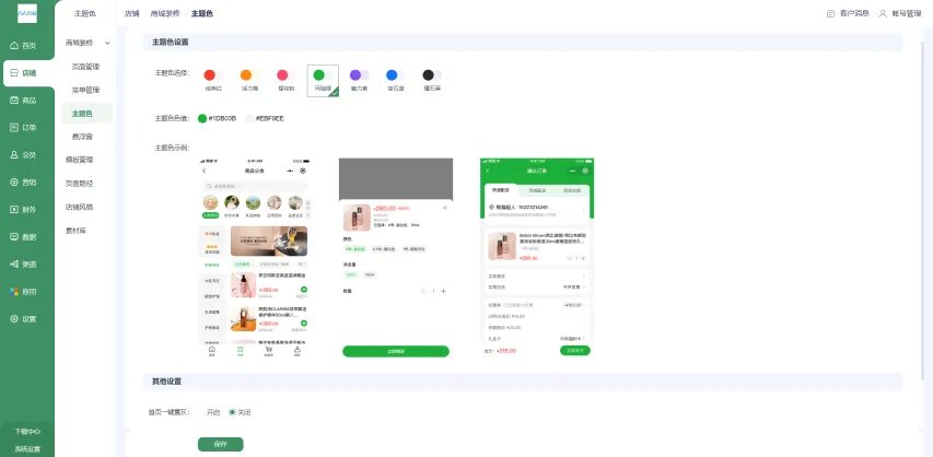 商家端 支持设置商城主题色,7种主题色可选,商城一键变身