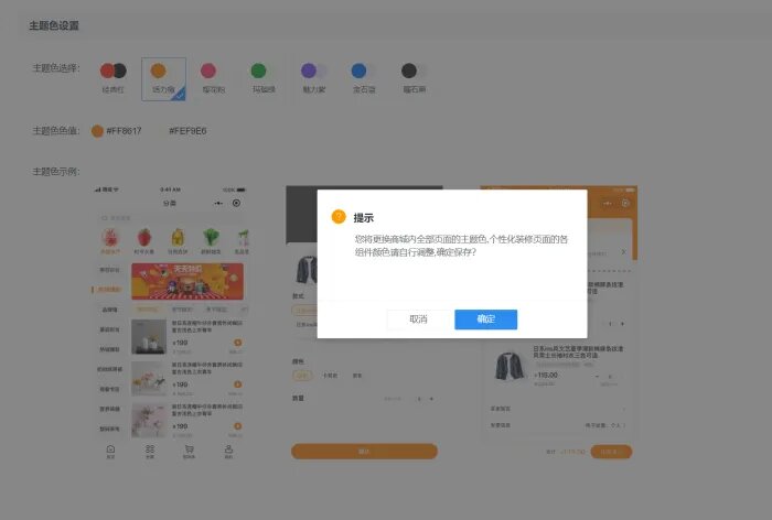 确定保存后页面自动刷新,商城全部涉及的页面和装修组件配色按主题色即时变更