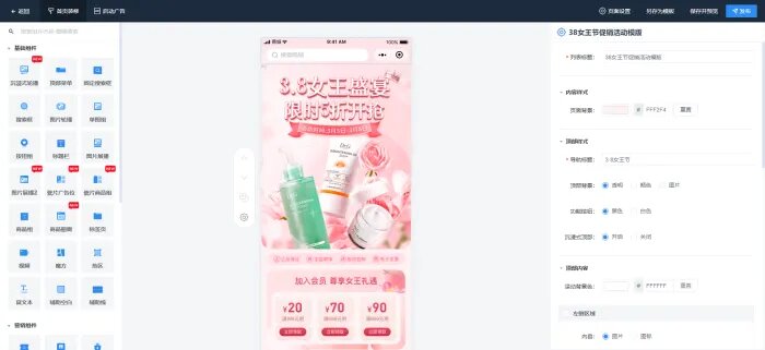 页面装修时可从左侧选择组件,支持基础组件、营销组件和功能组件,包含图片、商品组、按钮组和优惠等基础组件的编辑和添加