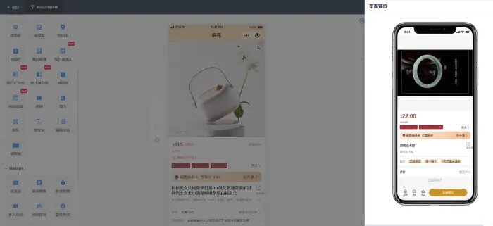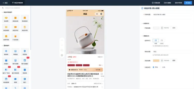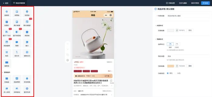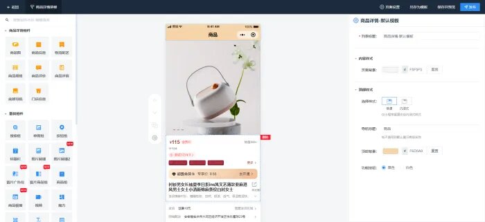 商品详情页中支持添加商品组、图片组以及列表导航等基础组件,同时也支持优惠券和公告等的营销组件