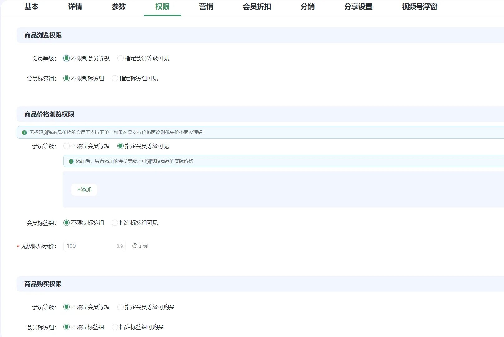 其中:如果权限同时设置了指定了会员等级和标签组可见,则满足其中任何一项的会员都可见;