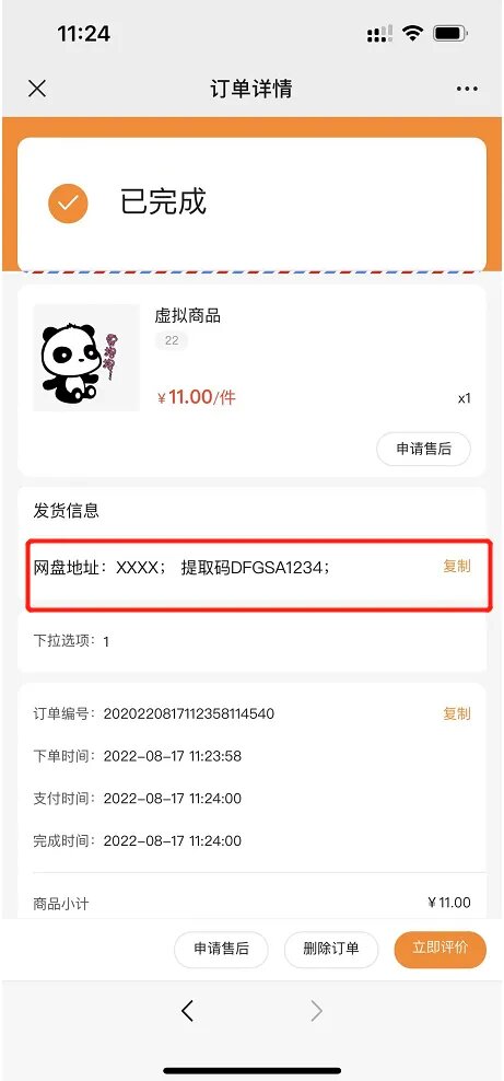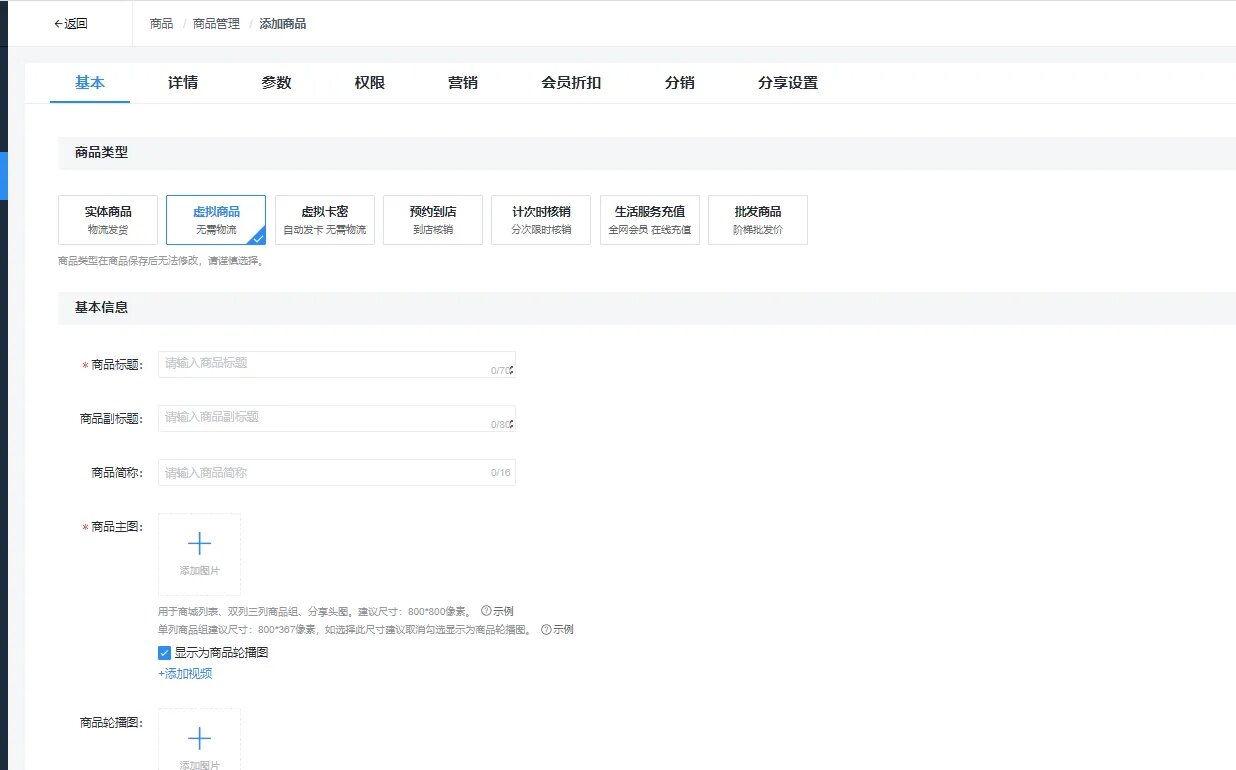 虚拟商品无重量、并且无需物流发货,因此与实体商品相比,虚拟商城不需要设置商品重量和物流信息以及货到付款;
