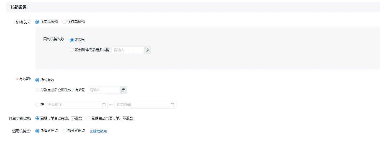 计次时核销商品,支持在有效期内进行:单件商品多次核销、单件商品不限次数核销、按商品件数核销、按订单一次性核销完成,实现了订单限时有效、分次核销的业务场景,比如指定服务项目次卡、限时不限次的会员卡等