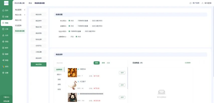 商品支持批量编辑,批量修改商品分类、批量编辑名称、库存、分销、会员折扣等